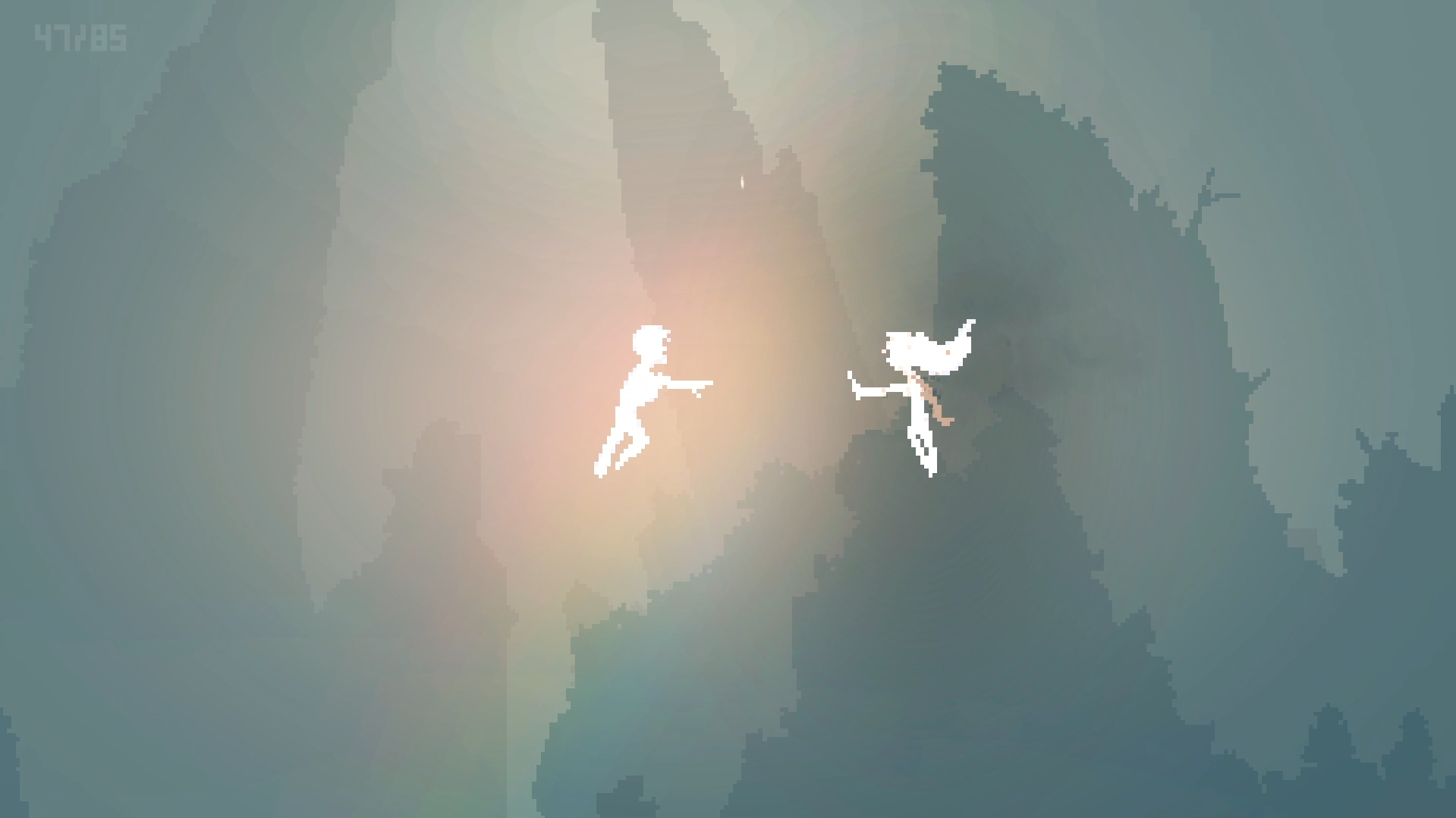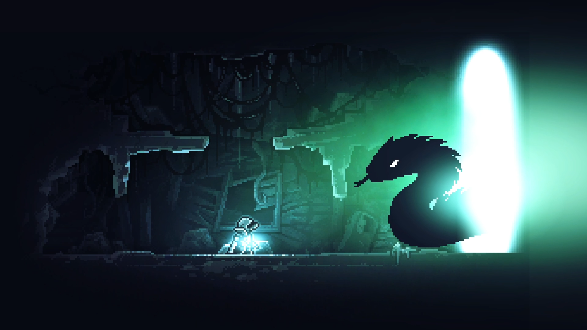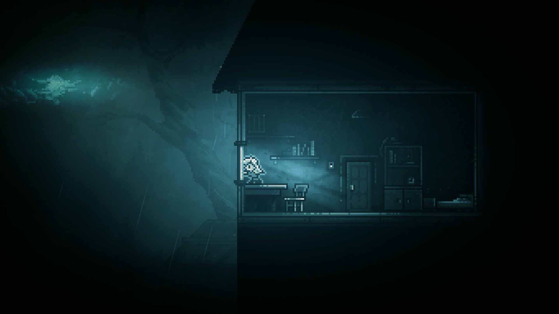 Comme les éclairs qui fendent l’arrière plan dès le lancement du jeu, Inmost frappe directement par son ambiance : les ruines d’un château lugubre toisant un chevalier plutôt inquiétant, une petite fille enfermée dans sa chambre une nuit d’orage, un homme seul dehors sous la pluie, aucun doute n’est laissé : on ne va pas rire une seul fois durant notre aventure ! Si le pixel art n’est pas particulièrement marquant, mais les effets de lumière, en HD eux, et surtout le choix de ne dépeindre chaque scène que par du monochrome. Généralement verdâtre ou bleuâtre, on est happé par l’humeur sombre et mélancolique du jeu.